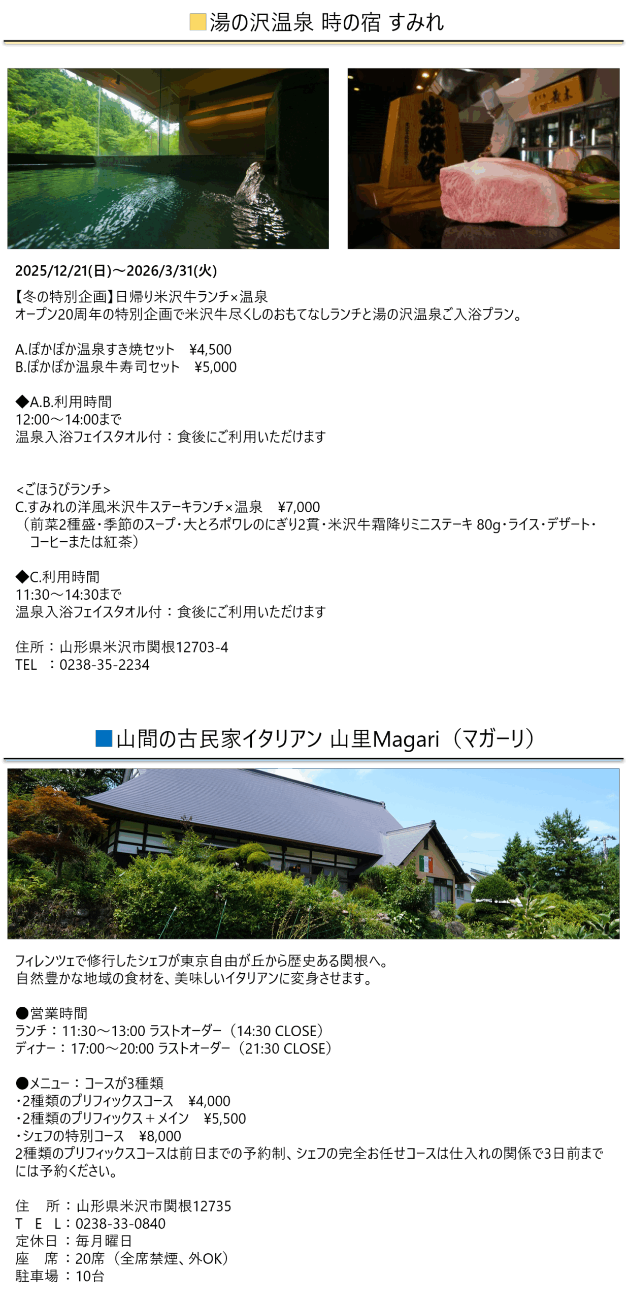 ホテル72館からのお知らせ No.4 今月のお勧めスポット 上杉鷹山ゆかりの地で”かてもの”イタリアン。米沢牛づくし+温泉を山里の関根で。Posted on 投稿日: 2026年1月1日更新日: 2025年12月26日 記事一覧