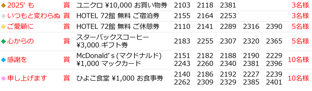 ホテル72館からのお知らせ No.2 「THANK YOU FOR COMMING 2025′ 大感謝祭!!」当選者Posted on 投稿日: 2026年1月26日更新日: 2026年1月29日 当選者の景品の交換は2/28(SAT)までです。 記事一覧